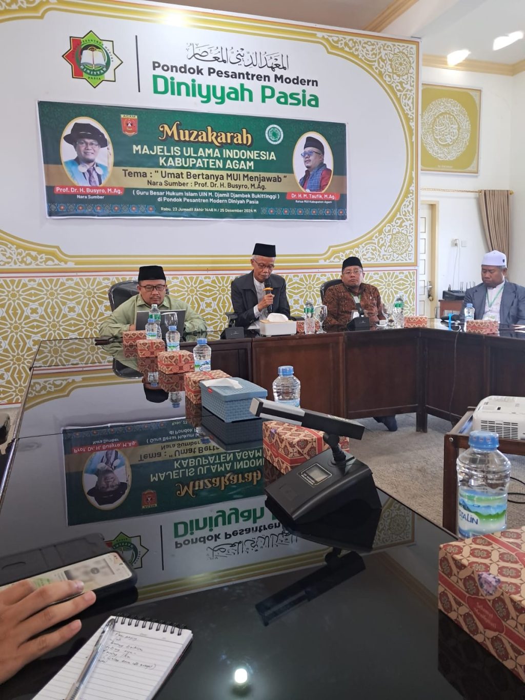 Alhamdulillah pada tanggal 25 Desember 2025 diselenggrakan muzakarah ulama se-kabupaten Agam terkait berbagai masalah keumatan dengan tema Umat Bertanya MUI Menjawab. Muzakarah ini langsung dipimpin oleh ketua MUI kabupaten Agam di Pondok Pesantren Diniyah Pasia.