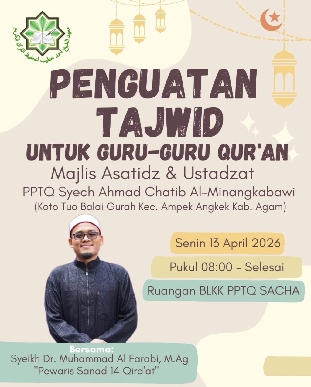 Senin 13 April 2026, Demi meningkatkan kompetensi guru-guru atau musyrif tahfiz di Pondok Pesantren Tahfizhul Quran Syech Ahmad Chatib Al-Minangkabawi, maka dilaksanakan kegiatan penguatan tajwid bagi musyrif tahfiz yang langsung dibimbing oleh ustadz DR. Muhammad Al-Farabi, MA dari Jakarta. Beliau adalah pewaris 14 sanad qiraat.
